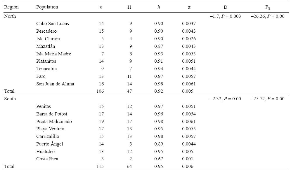 Tabla 2: Diversidad genética de Plicopurpura pansa a lo largo de la costa del Pacífico mexicano: n = tamaño de muestra, H = número de haplotipos por sitio, h = diversidad haplotípica, π = diversidad nucleotídica, D = D de Tajima y FS = FS de Fu.