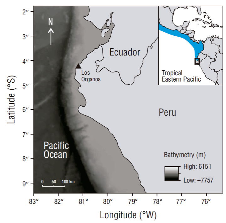 Figura 1 Punto de muestreo para el estudio de contenido estomacal de la raya bruja Rostroraja velezi. El área sombreada de azul delimita la ecoregión marina del Pacífico Oriental Tropical.