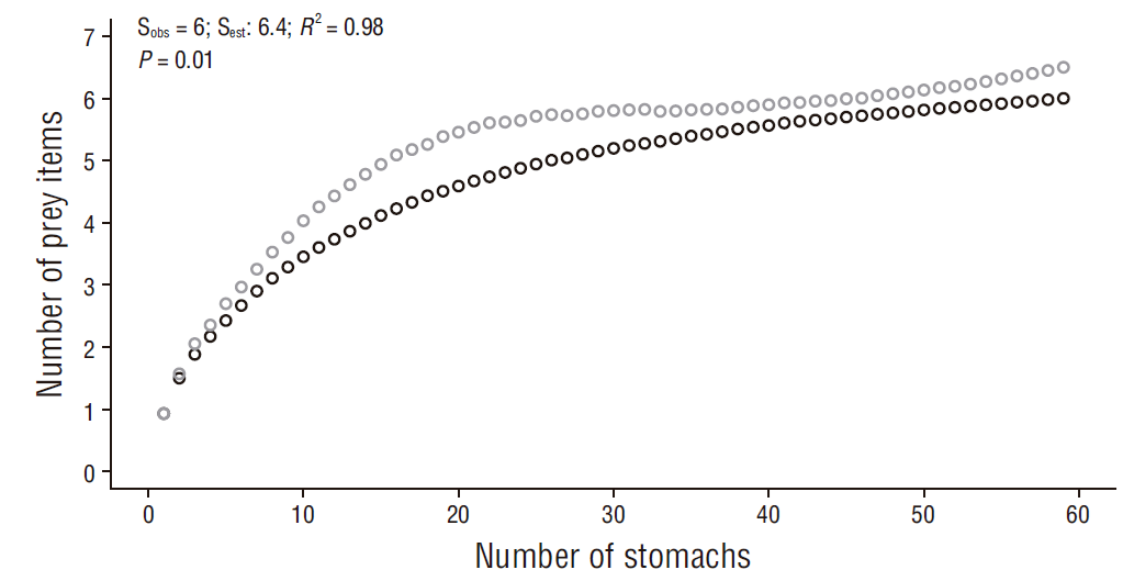 La eficiencia del muestreo fue determinada mediante las curvas acumulativas (Ferry y Cailliet 1996) en función del estimador no paramétrico Chao 1, basado en las abundancias de las categorías presa (Colwell y Coddington 1994) y analizado aplicando 999 remuestreos en el programa EstimateS 9.1 (Escalante-Espinosa 2003, Colwell 2013, Flores-Ortega et al. 2015). Para la construcción de la curva de presa acumulada, se excluyeron los individuos con estómagos vacíos y las presas no identificadas, y se utilizaron categorías agrupadas por orden y familia. El tamaño de la muestra se consideró confiable para describir la dieta si las curvas alcanzaban una pendiente menor que 0.1 (Soberón y Llorente 1993, Ferry y Cailliet 1996, Magurran 2004). También se calculó la eficiencia del muestro, y el desempeño del estimador, considerando sesgo y exactitud (Chiarucci et al. 2003, Walther y Moore 2005). Se utilizó el programa estadístico R v.3.2.2 (Core Team 2016) para la modelación de las curvas y la obtención del coeficiente de determinación (R 2 ). Se consideró un buen desempeño del estimador si los valores de sesgo y exactitud, que pueden variar entre -1 y 1, eran cercanos a cero (Palmer 1990, Brose et al. 2003). Un R 2 igual o cercano a uno acompañado de un valor de P < 0.05 determina un buen ajuste entre ambas curvas (Motulsky y Christopoulos 2003).