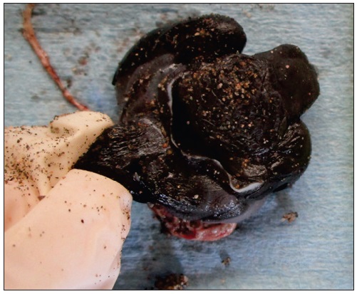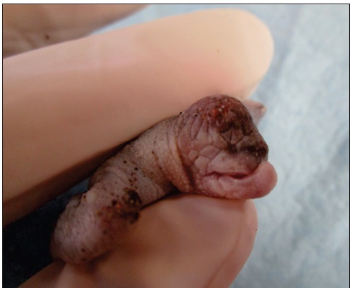 Se examinaron todas las crías vivas y los embriones muertos para detectar malformaciones. La inspección visual se realizó de manera sistemática siguiendo una orientación craneal-caudal y dorsal-ventral. Si un embrión o una cría mostraba malformaciones múltiples, se separaban y se registraba cada tipo de malformación, y se procedió a la toma de fotografías de cada caso (e.g., Figs. 1-3). Las malformaciones fueron clasificadas por región anatómica, tipo de malformación e intensidad.
