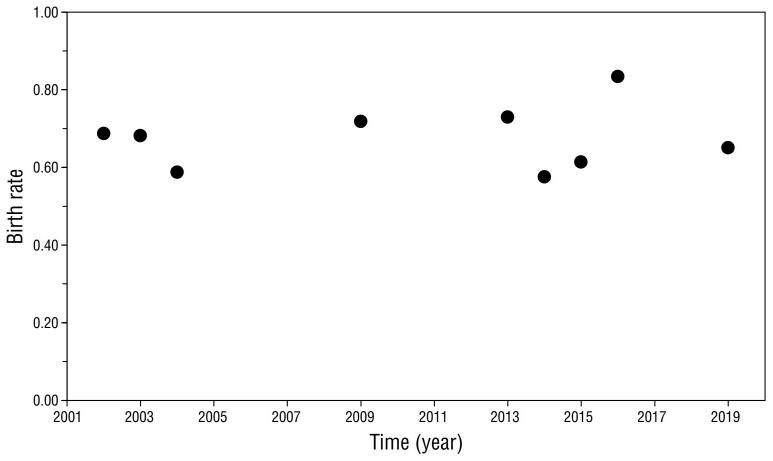 La tasa de natalidad, que representa la proporción de hembras adultas que dan a luz en un año (Croxall y Hiby 1983), se calculó para cada temporada dividiendo el número de crías producidas por el número total de hembras adultas. Se realizó una prueba Z para analizar las variaciones de la tasa de natalidad a lo largo del periodo de estudio.