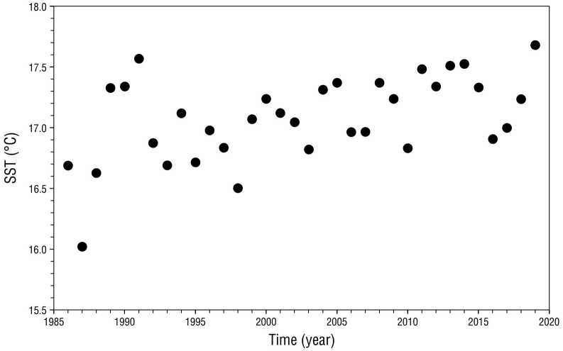 Dado que la TSM presentaba una tendencia positiva y significativa en la zona de estudio (ver más adelante), calculamos las anomalías mensuales para el periodo 2001-2019 siguiendo la metodología del Climate Prediction Center for the Oceanic Niño Index (http://cpc.ncep.noaa.gov, revisado el 10 de septiembre de 2022), la cual consiste en utilizar periodos base de 30 años para detectar anomalías en periodos sucesivos de 5 años. Así, para los años 2001-2004 se utilizó el periodo base 1986-2015, y para 2005-2009 el periodo base 1991-2020. No obstante, dado que para los 2 últimos periodos de 5 años (2010-2014 y 2015-2019) las series temporales correspondientes a los periodos base 1996-2025 y 2001-2030 no están completas, se utilizó el periodo base de 1991-2020.