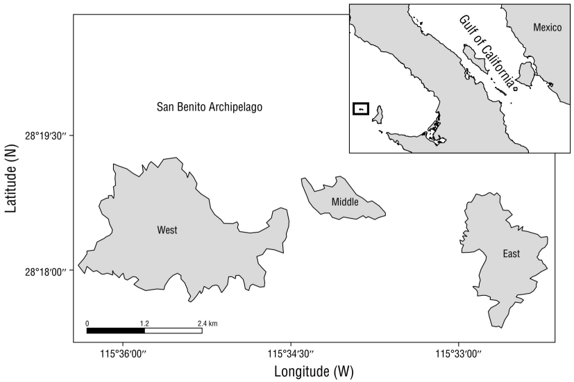 El archipiélago San Benito está conformado por 3 islas volcánicas, llamadas Este, Centro y Oeste, y un grupo de islotes (Fig. 1). El archipiélago forma parte de la Reserva de la Biosfera Islas del Pacífico de la península de Baja California y se encuentra en el Pacífico frente a México (28°18ʹ N, 115°32ʹ O), 31.5 km al oeste de la isla de Cedros y a 130.0 km de la península de Baja California. El clima es árido con una precipitación anual media de 65.1 a 121.3 mm, y los meses de diciembre a febrero son los más lluviosos. La temperatura anual promedio varía entre 19 y 20 °C (Junak y Philbrick 1999).