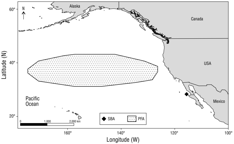 Figura 2 Área potencial de alimentación (PFA, por sus siglas en inglés) de hembras adultas de elefante marino del norte de la colonia del archipiélago San Benito (SBA, por sus siglas en inglés). Polígono basado en Aurioles-Gamboa et al. (2006).