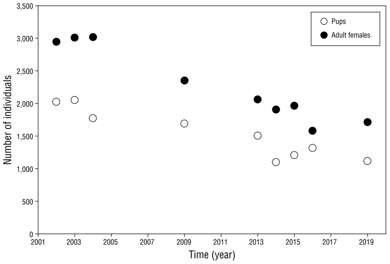 Figura 3 Número de crías y hembras de elefante marino del norte en la colonia de San Benito en 2002-2019.