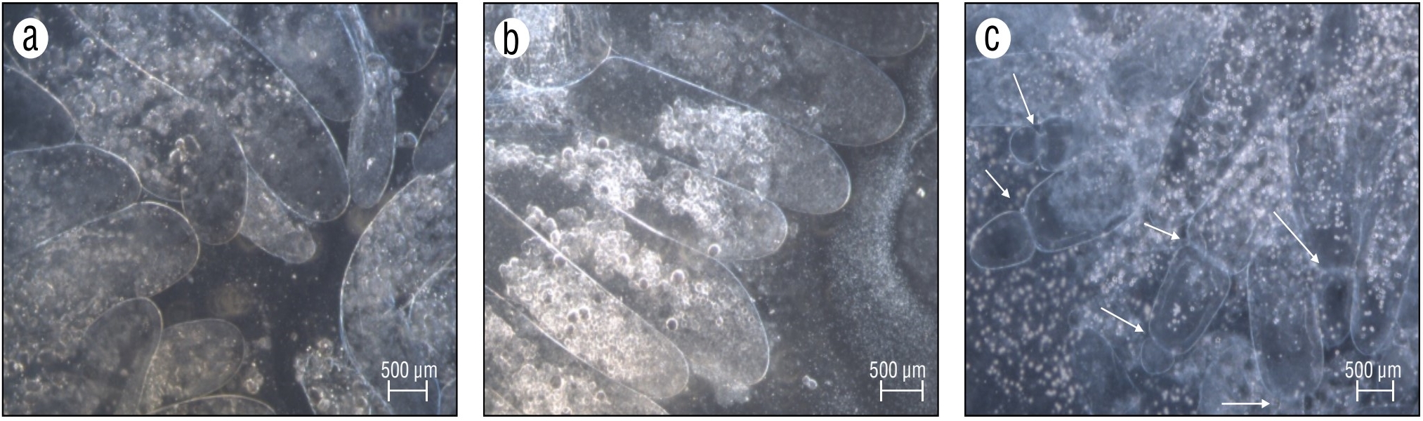 Figura 1 Preparación en fresco de los túbulos hepatopancreáticos de Penaeus vannamei. Túbulos hepatopancreáticos de (a) organismos sin tratamiento (NC) y (b) organismos desafiados con la cepa Escherichia coli DH5α (Eco). (c) Constricción de los túbulos hepatopancreáticos (resaltada con flechas) de organismos desafiados con la cepa de Vibrio parahaemolyticus CVP2 (CVP2). Aumento 100×.