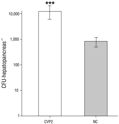 Figura 2 Estimación de la carga de Vibrio parahaemolyticus expresada como unidades formadoras de colonia (CFU) por hepatopáncreas, a partir de organismos desafiados con la cepa CVP2 de V. parahaemolyticus y de organismos no desafiados (control negativo [NC]). Los resultados se representan como media ± desviación estándar. La significancia estadística se determinó mediante una prueba t de Student no pareada de 2 colas (***, P < 0.001).