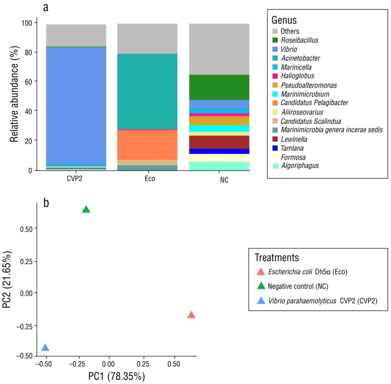 Figura 3 Análisis metagenómico mediante la secuenciación del gen de ADNr 16S (región V4) del hepatopáncreas de camarones desafiados con la cepa de Vibrio parahaemolyticus CVP2. (a) Estructuras de las comunidades bacterianas del hepatopáncreas de camarón comparadas entre tratamientos (CVP2, Eco y NC) al nivel taxonómico de género. (b) Análisis de componentes principales de las estructuras de las comunidades bacterianas entre tratamientos: V. parahaemolyticus (CVP2), Escherichia coli (Eco) y organismos sin tratamiento (NC).