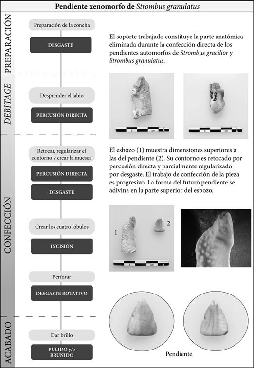 En comparación con un espécimen natural de Strombus gracilior se nota que la parte del labio fue eliminada en gran parte. Sobre el pendiente de la sepultura 1 de Cerritos Colorados, la regularización por desgaste ha borrado las huellas de esta acción; sin embargo, gracias a los esbozos presentes en las colecciones se puede proponer un desprendimiento por medio de percusión directa. El proceso podría ser completado por retoques del plano de fractura también por percusión (o presión).