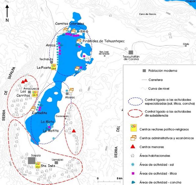 Durante dicho periodo, el material malacológico es encontrado en abundancia, no sólo disperso en la superficie de los asentamientos arqueológicos, sobre sitios clasificados como áreas de actividades (sal, lítica, concha; véase la Figura 2) así como en sitios de producción y almacenamiento, sino también en contextos funerarios, formando parte de ajuares u ofrendas mortuorias. No pudimos delimitar talleres en el espacio, al contrario, las áreas de actividades parecían extenderse de manera muy amplia (hasta 2 km), lo que sugiere una posible movilidad de los artesanos (Mas, 2018: 375). La ocupación de todos los asentamientos estudiados es contemporánea y corresponde al periodo de auge de Sayula (450-1000 d. C.). Se estudió un total de 10 806 piezas procedentes de once asentamientos ubicados en el lecho lacustre (véase la Figura 2, Tabla 1).6 Estos once sitios se inscriben dentro del patrón de asentamiento jerarquizado propuesto para la fase Sayula por Liot et al. (2007) de la forma siguiente: La Picota y Los Cerritos son clasificados como centros cívicoceremoniales donde se concentra el poder político y religioso. Cerritos Colorados, Km 6, Pirámides de Tehuantepec, San Juan Atoyac y Carmelita representan centros de control de producción y almacenamiento, redistribución de recursos claves o estratégicos (sal, lítica, concha). Estos sitios se encuentran en los niveles de playa y/o dunas circunvecinas a ésta, junto a los talleres de producción de sal y áreas de actividad de lítica y concha. Dentro de esta última categoría se encuentran los sitios Anoca, Playa de La Picota, La Mota y La Motita.