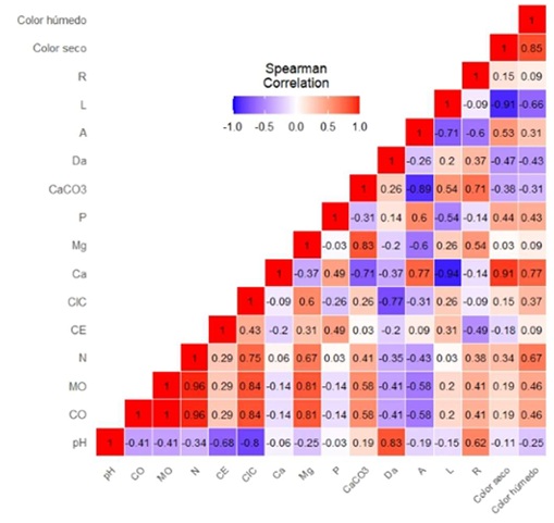 La prueba de esfericidad de Barttlet arrojó valor de ρ cercano a cero (P < 0.05), esto significa que las correlaciones entre las variables fisico-químicas fueron significativas. Las correlaciones que se encontraron (Figura 1) fueron: pH con Da (r = 0.83) y con CIC (r = -0.8); MO con N (r = 0.96), con CIC (r = 0.84) y Mg (r = 0.81). La variable Ca se correlacionó con Color seco (r = 0.91) y con L (r = -0.94); Mg con CaCO3 (r = 0.83) y CaCO3 con A (r = -0.89). Color seco se correlacionó con Color húmedo (r = 0.85) y con L (r = -0.91).