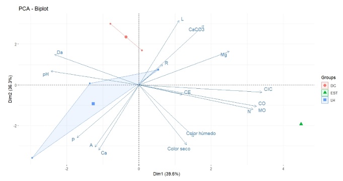 La diferencia de las características del suelo entre las parcelas se reafirma con las variables más representativas de cada parcela, las cuales se resaltan en elipses de cada color (verde para la parcela LH, rosa para DC y morado para EST) (Figura 3). Al comparar estos resultados y los obtenidos en el Cuadro 1, coinciden en que la parcela LH se caracteriza por tener suelos con altos valores en el contenido de Ca, los valores más altos de P, aunque de manera insuficiente y predominancia de la fracción arenosa en la textura del suelo; en la parcela DC los suelos contienen alto contenido de Mg, CaCO3 y predominancia de la fracción limosa, y en EST el suelo tiene alto contenido de MO, CO, N y los suelos con la mayor CIC.