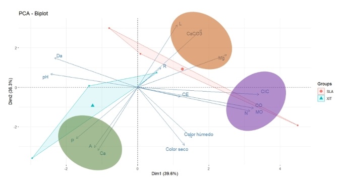 Respecto al análisis de componentes principales (ACP), se observó que con dos componentes o dimensiones se cubrío más de 50% de la variabilidad de los datos, es decir, el componente 1, explicó 39.3% y el segundo 36.3%. Las variables que explican el primer componente son: CO, MO, N y CIC; mientras que para el componente 2, las variables fueron: Ca, P, CaCO3, A, L, Color seco y Color húmedo (Cuadro 2).