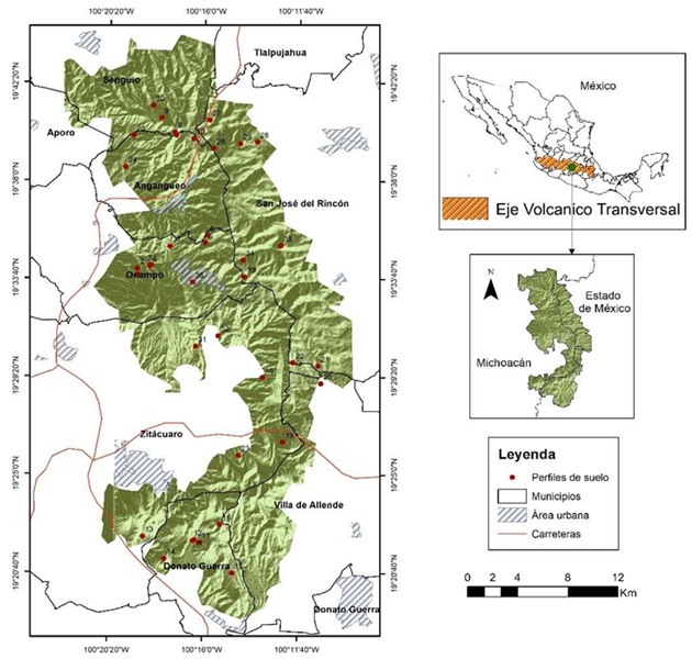 Para la ubicación de los sitios de muestreo, se realizaron transeptos de acuerdo con la topografía, en donde se ubicaron 37 perfiles de suelo, que fueron georreferenciados y, en cada uno, se colectó muestra de suelo mineral en cada sitio. Los suelos forestales fueron considerados sin alteración, estuvieron caracterizados por cubierta de bosques de coníferas Abies religiosa y pinus; se consideraron suelos agrícolas cultivados con maíz y avena por al menos 10 años, para cada condición se seleccionaron al menos 5 perfiles, para poder realizar el análisis estadístico (ESRI, 2022).
