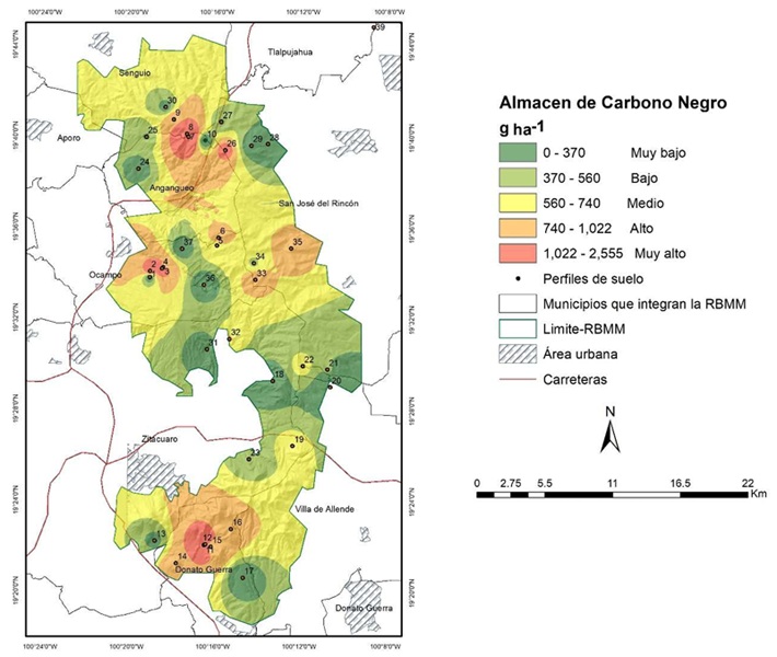 Los estudios de carbono en el suelo son necesarios para estimar los almacenes y la dinámica de este elemento en ecosistemas templados y para tomar en cuenta el CN del suelo en los inventarios de almacén de carbono global; además, es importante debido a la obtención de proyecciones del cambio climático futuro (Mastrolonardo, Francioso y Certini, 2018), así como para evaluar el impacto que tienen las políticas públicas (plantaciones forestales maderables, labranza de conservación, sistemas de cultivo intercalado con árboles frutales, sistemas silvopastoriles) y en bosques con plan de manejo forestal (Galicia et al., 2016). Conocer la distribución espacial del CN permite en un futuro desarrollar una metodología que dé cuenta del CN en los inventarios de gases de efecto invernadero, así como una mejor comprensión del papel que juega en el balance del ciclo del carbono. También es una herramienta para reconstruir la actividad del fuego de épocas pasadas y mejorar las propiedades físicas, químicas e incremento de infiltración de agua en el suelo en la actualidad. El objetivo de esta investigación fue estimar el Carbono Negro en los suelos de la Reserva de la Biosfera de la Mariposa Monarca (RBMM).