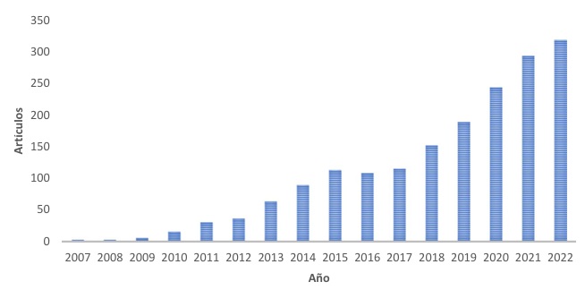 En cuanto a la producción anual total, se puede observar un incremento en forma exponencial en la publicación de artículos y revisiones sobre esta temática (Figura 1). Es de especial interés que los primeros artículos sobre el biocarbón son relativamente recientes (alrededor de 2007), por lo que es relevante la atención que le ha dado la comunidad científica a este material en tan corto tiempo. En México se registran 8 publicaciones para el mismo periodo, en años recientes (2015 a 2021).