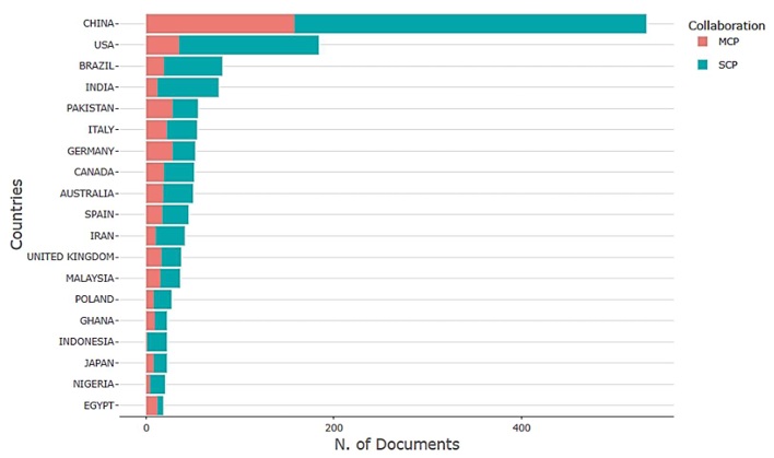 También se analizó el origen de los artículos por países. Los 15 países con mayor producción de trabajos relacionados con el biocarbón se pueden observar en la Figura 2, entre ellos destacan China y Estados Unidos como líderes en publicaciones sobre esta temática. Esto es consistente con el estudio de Pérez-Cabrera et al. (2021), quienes también observan que estos países han sido pioneros en la investigación sobre los beneficios del biocarbón en la agricultura y su rol en la mitigación del cambio climático. Se destaca que, además de liderar la producción de artículos sobre biocarbón, China también sobresale por su elevada colaboración internacional, lo que pone de manifiesto su cooperación global a este campo de investigación.