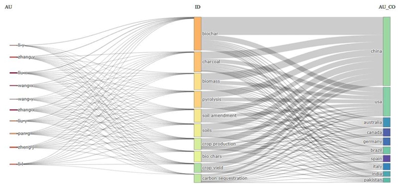 Con la finalidad de observar la interacción entre los 10 autores más productivos del mundo, las 10 palabras clave más utilizadas y los 10 países con mayor cantidad de trabajos sobre la elaboración, aplicación y sostenibilidad del biocarbón, se elaboró un diagrama de Sankey (en el que se destaca la métrica con base en autores). En la Figura 3 se presenta este análisis y se puede observar que los 10 autores representados son de origen chino. Esto indica el alto grado de interés que esa nación le otorga a la investigación sobre el uso de bioinsumos agrícolas como el biocarbón. Sin embargo, también muestra que es un campo de interés global, pues hay contribuciones significativas de otras naciones como Estados Unidos, Australia, Alemania e India.