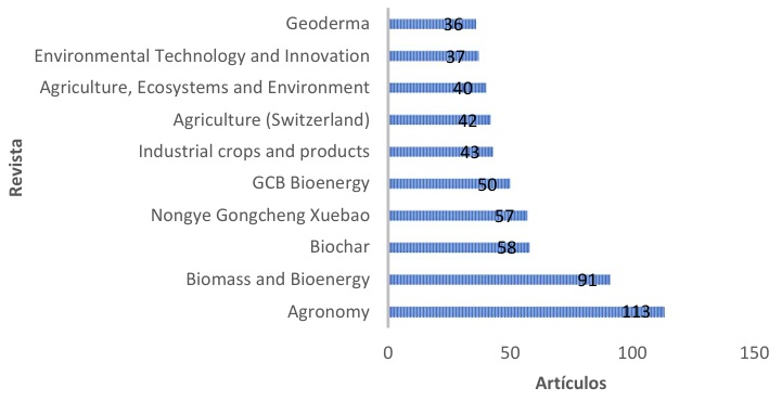 Se identificaron las revistas con mayor cantidad de aportaciones sobre la temática bajo análisis (Figura 4). En este sentido, destacan dos revistas en particular, Agronomy y Biomass and Bioenergy, las cuales suman 204 artículos. Ambas revistas son de acceso abierto. El factor de impacto de estas revistas es de 3.3 y 5.8 respectivamente, lo que las posiciona como fuentes relevantes y de creciente influencia en el campo del biocarbón. En el caso de la revista Biochar, la cual aparece en la tercera posición en número de artículos para el mismo periodo de tiempo, nació como una revista especializada que aborda la temática relacionada con el biocarbón y va de la mano con la tendencia de investigación de este material a nivel global. Con un factor de impacto de 13.1, Biochar se destaca como una de las publicaciones más prestigiosas en este ámbito, lo que refuerza la importancia de los artículos publicados en ella para el avance científico en la aplicación y sostenibilidad del biocarbón.