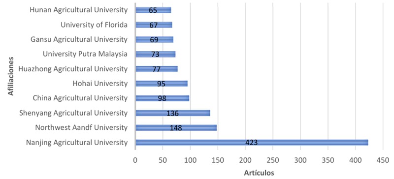 Las afiliaciones de los autores o universidades, que están detrás de las investigaciones en esta temática, son principalmente de origen chino. La Universidad Agrícola de Nanjing es la afiliación con mayor número de artículos publicados, seguida por la también china Northwest A&F University (Figura 5). Este enfoque académico que se centra en ciertos países hace ver la necesidad de identificar las mejores fuentes y colaborar con instituciones de vanguardia. Para los investigadores y profesionales en otras naciones, como México, este resultado revela que es importante fortalecer las relaciones con estas instituciones a través de intercambios académicos y proyectos conjuntos. Esto podría facilitar el acceso a las últimas investigaciones sobre biocarbón, además de promover la implementación de prácticas y tecnologías avanzadas en el contexto agrícola nacional.
