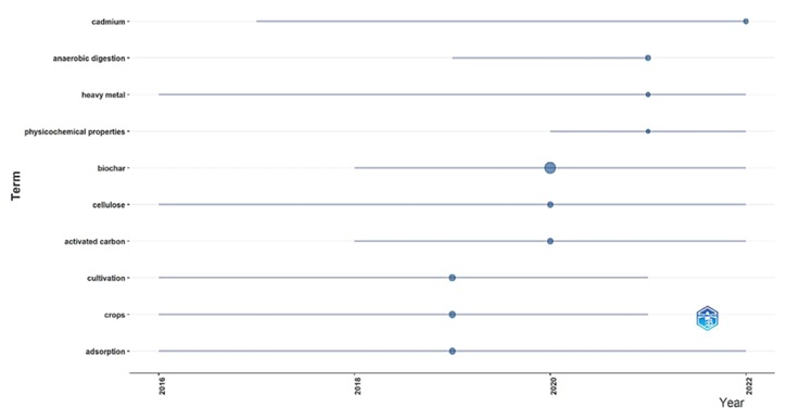 Pérez-Cabrera et al. (2021) señalan en un estudio previo sobre el estado del arte del biocarbón que “la mayoría de los estudios han reportado efectos positivos en el crecimiento y rendimiento de los cultivos agrícolas, y que es necesario incrementar las investigaciones de biocarbón elaborado con biomasa vegetal y materiales orgánicos de disponibilidad local”. Sin embargo, no se abordan tendencias futuras de investigación sobre el tema. La Figura 6 muestra un gráfico con las palabras clave más frecuentemente usadas junto con “biocarbón” en los últimos cinco años, la cual puede servir como guía a los investigadores relacionados con esta temática. Entre las más recientes están: “cadmio”, “digestión anaeróbica”, “metales pesados” y “propiedades fisicoquímicas”.