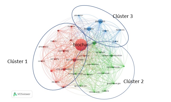 En el análisis con VOSviewer se identificaron tres clústeres: el primero (color rojo) tuvo 15 elementos que incluye al biocarbón como palabra más importante, relacionado con palabras sobre los beneficios de este material en el suelo. El segundo clúster (color verde) las palabras clave relacionadas con los beneficios del biocarbón para la reducción de los gases efecto invernadero, como el secuestro de carbono, metano y óxido nitroso. El tercero (color azul) incorpora palabras relacionadas con la producción y elaboración del biocarbón, desde biomasa, materias primas y la pirólisis (Figura 7).