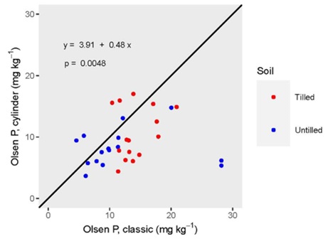 Figure 1: Association between the Olsen P determined by the classic method (Olsen P, classic) in disturbed soil samples (Tilled) and the Olsen P determined in undisturbed soil samples (Olsen P, cylinder; Untilled). The black line represents the 1:1 relationship.