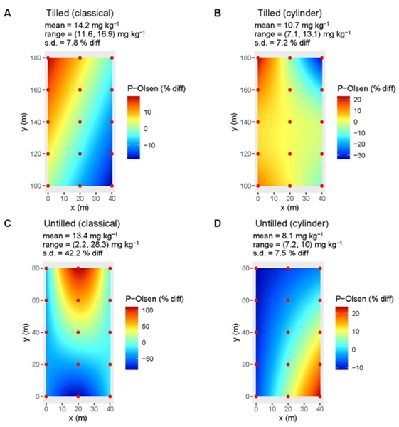 Although there was variation in the Olsen P for the four combinations of soil Olsen P, the spatial dependence was very low. This is reflected in the low effective dimensions for the linear and spline spatial components, and in the predicted surfaces (Figure 2). In most cases, the variation was low, with ranges within the ± 20% variation, relative to the mean of the observed Olsen P, leading to standard deviations of 7.8% (tilled, classic, Figure 2A), 7.2 % (tilled, cylinder, Figure 2B) and 7.5% (untilled, cylinder, Figure 2D). The exception was one point in the untilled, classical, which had 28.4 mg kg-1 Olsen P, leading to a standard deviation of 42.2% (expressed as a percentage of difference compared to the mean of the observations, Figure 2C).