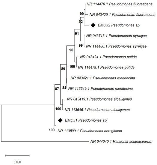 En la Figura 1 se presenta el árbol filogenético de los aislamientos de basados en las secuencias de ARNr 16S, se utilizó Ralstonia solanacearum (NR_044040.1) como grupo externo (outgroup) para enraizar el árbol filogenético. Las secuencias identificadas como BMOJ1 y BMOJ2, indicadas por diamantes negros en el árbol, mostraron relaciones taxonómicas dentro del género Pseudomonas. La secuencia BMOJ1 se agrupa con P. aeruginosa formando un clado con un valor de soporte bootstrap del 100%. Este agrupamiento sugiere que BMOJ1 está estrechamente relacionada con estas especies. La secuencia BMOJ2 se agrupa con P. fluorescens (NR_043420.1 y NR_114476.1). Este resultado sugiere que BMOJ2 está estrechamente relacionada con P. fluorescens, la cual es una especie reconocida como agente de control biológico y promotora del crecimiento de las plantas. Hernández-Montiel et al. (2020) evaluaron variables morfométricas, rendimiento y otras variables en plantas de pimiento morrón variedad ‘California Wonder y reportan que los resultados indicaron que las bacterias incrementaron todos las variables morfométricas y de productividad y que, el uso de Pseudomonas putida como un bio-fertilizante puede ser importante en la producción de especies hortícolas como el pimiento morrón.