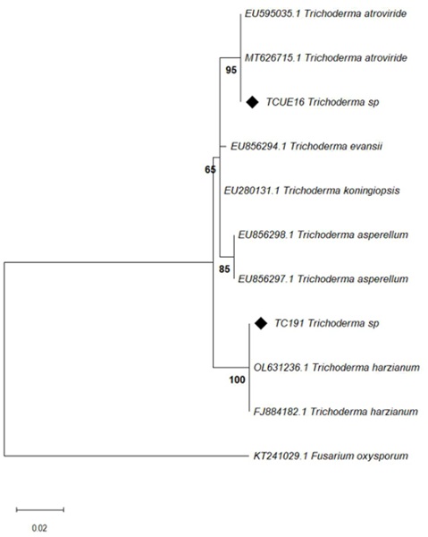 Las secuencias de Trichoderma spp. (indicada por un diamante negro) se analiza en dos posiciones diferentes dentro del árbol filogenético, representando a los aislados TCUE16 y TC191. La secuencia de TCUE16 se agrupa con Trichoderma atroviride (EU595035.1 y MT626715.1) con un soporte bootstrap del 95%. Este alto valor de bootstrap indica una fuerte relación evolutiva entre TCUE16 y Trichoderma atroviride, sugiriendo que comparten un ancestro común reciente. Trichoderma atroviride, es un agente de control biológico, que presenta capacidad de antagonismo contra diversos fitopatógenos (Liu et al., 2023) (Figura 2).