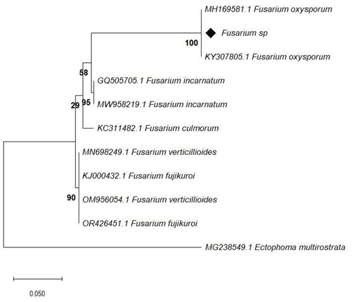 La comparación de toda la región ITS (ITS1, 5.8S rDNA e ITS4) del aislado de Fusarium sp. con las previamente depositadas en el GenBank mostró una cobertura del 100% con una identidad del 100% con F. oxysporum (MH169581.1). La secuencia de Fusarium sp. (indicada por un diamante negro) se agrupa en un clado con F. oxysporum, específicamente con las secuencias MH169581.1 y KY307805.1. Este clado tiene un soporte bootstrap del 100%, lo que proporciona una fuerte evidencia de que estas secuencias comparten un ancestro común reciente. La alta confiabilidad de este clado sugiere que la secuencia de Fusarium sp. está estrechamente relacionada con F. oxysporum (Figura 3).