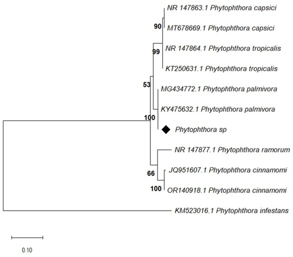 El análisis de identificación molecular reveló que el aislamiento PMJ1, se identificó como Phytophthora palmivora, el cual mostró una cobertura del 100% con una identidad del 100% en la secuencia registrada en la base de datos NCBI/GenBank bajo el número de acceso MG434772.1. La secuencia de Phytophthora sp. (indicada por un diamante negro) se agrupa en un clado con P. palmivora (MG434772.1 y KY475632.1), con un soporte bootstrap del 100%. Este alto valor de bootstrap indica una fuerte evidencia de que estas secuencias comparten un ancestro común reciente, sugiriendo que Phytophthora sp. está estrechamente relacionada con P. palmivora (Figura 4).