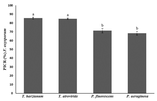 La Figura 5 muestra la inhibición de crecimiento micelial (PICR) de F. oxysporum en presencia de diferentes agentes de control biológico: T. harzianum, T. atroviride, P. fluorescens y P. aeruginosa. Los resultados indicaron que T. harzianum y T. atroviride presentan una alta eficacia en la inhibición de F. oxysporum, con porcentajes de superiores del 80%, significativamente mayores en comparación con P. fluorescens y P. aeruginosa (Figura 5).