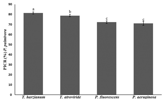 En la evaluación del porcentaje de inhibición del crecimiento radial (PICR) de Phytophthora palmivora, se observaron diferencias significativas entre los tratamientos evaluados (P < 0.05). T. harzianum mostró el mayor porcentaje de inhibición con un 82%, con diferencias significativas con el resto de los tratamientos. P. fluorescens y P. aeruginosa no presentaron diferencias significativas entre ellos (Figura 6).