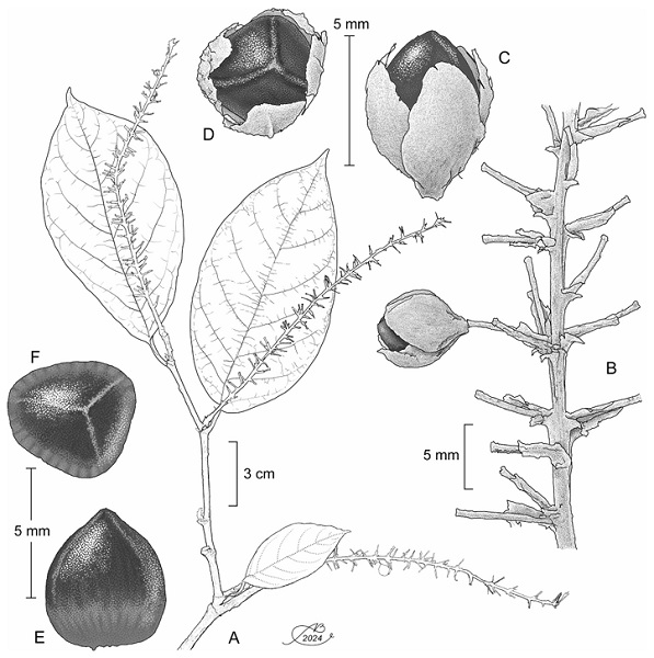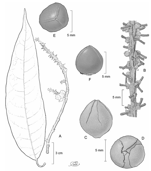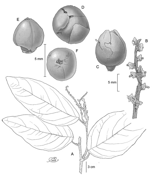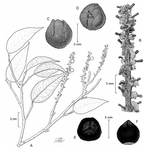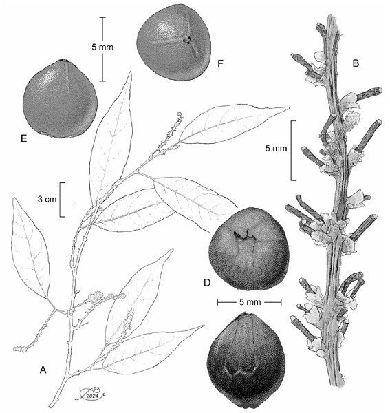 Figure 1: Coccoloba burgeri J.J. Ancona, P. Hern.-Led. & J.J. Ortiz-Díaz. A. branch showing leaves and fruits; B. details of the inflorescence; C. diclesium lateral view; D. diclesium polar view; E. achene lateral view; F. achene polar view. Illustrations by Alfonso Barbosa.