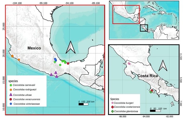 Physical and digital specimens from various herbaria were observed, including type specimens. The existing taxonomic literature on the genus Coccoloba was also consulted. The morphological description, illustrations, distribution map, as well as the assessment of the conservation status of each of the new species are presented. A dichotomous key to all species of the sect. Campderia from Mexico and Central America is included.