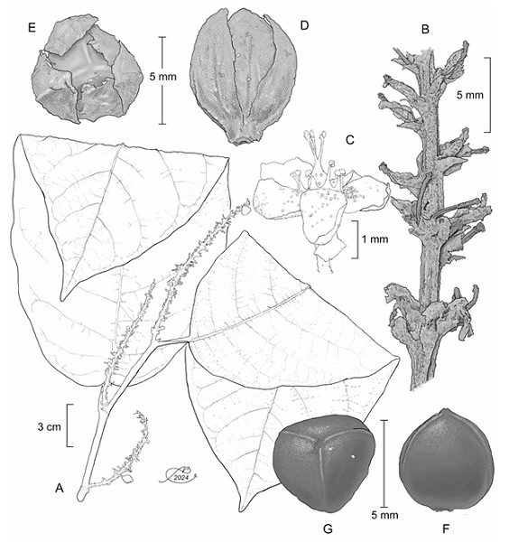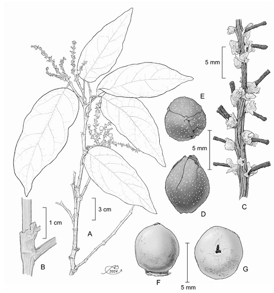 Figure 5: Coccoloba glandulosa J.J. Ancona, P. Hern.-Led. & J.J. Ortiz-Díaz. A. branch showing leaves and fruits; B. details of the inflorescence; C. flower; D. diclesium lateral view; E. diclesium polar view; F. achene lateral view; G. achene polar view. Illustrations by Alfonso Barbosa.