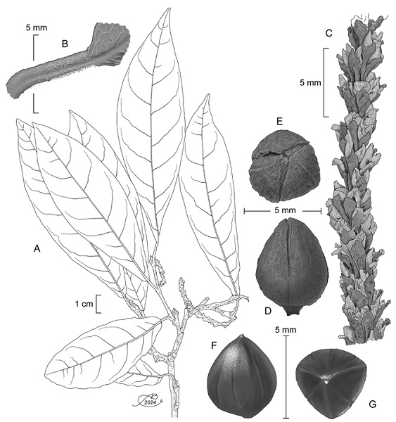 Figure 3: Coccoloba carnevalii J.J. Ancona, P. Hern.-Led. & J.J. Ortiz-Díaz. A. branch showing leaves and fruits; B. ochrea; C. details of the inflorescence; D. diclesium lateral view; E. diclesium polar view; F. achene lateral view; G. achene polar view. Illustrations by Alfonso Barbosa.