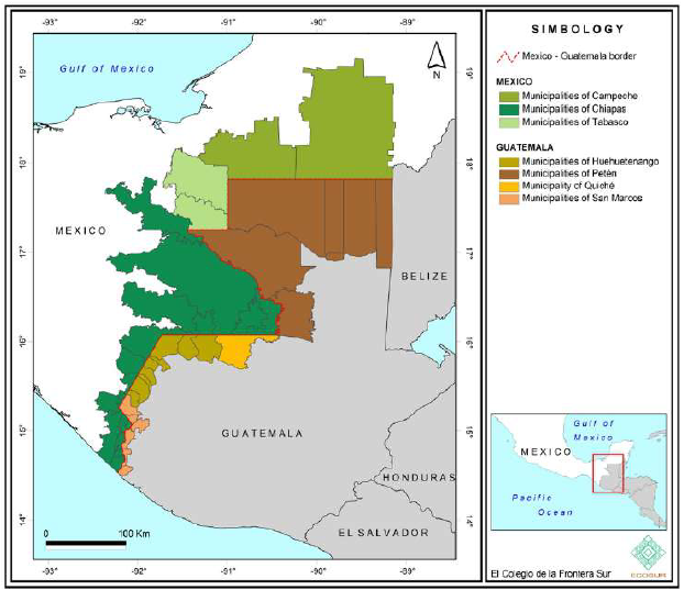 In Map 1, the geographic borders established in the international dividing line, which is straight in some sections, while in others, follows the Suchiate and Usumacinta Rivers or Sierra Madre de Chiapas, as well as the political division of these territories, with the Mexican states on one side, and the Guatemalan departments on the other; as a set, these are the border zone, which comprises 45 municipalities, 22 on Mexico’s side, and 23 on Guatemala’s.