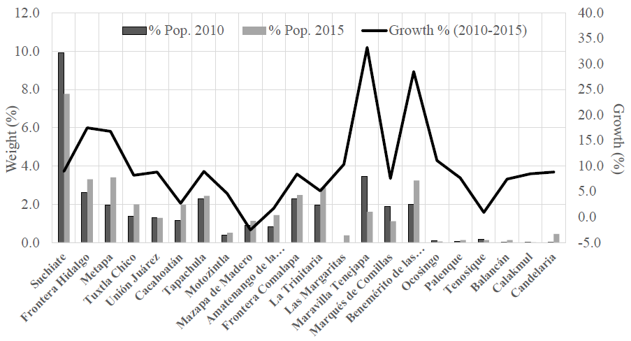 In the municipalities with the highest demographic dynamics (Suchiate, Frontera Hidalgo, Metapa, Tapachula, Maravilla Tenejapa, and Benemérito de las Américas), there is heavier border transit and mobility at both sides, but with more intensity toward Mexico because of the transit of Guatemalans and Central Americans; though this is not the case in Mazapa de Madero, whose geographic location in Sierra de Chiapas makes access to the zone difficult. In 2010, a total of 13 390 individuals were counted, while in 2015, this figure reached 21 165, which accounted for a growth of 21.7%, at a rate of almost 4% a year.