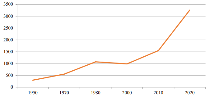 Gráfica 1. Personas nacidas en África residiendo en México, 1950-2020Nota: La gráfica no incluye datos de los censos de 1960 y 1990, debido a que no se encontró información.