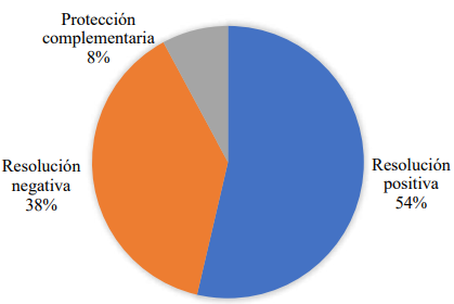 Por otra parte, la información obtenida a partir de los registros de la Comar permite identificar el sentido de las resoluciones emitidas a las solicitudes de refugio. Como se observa en la gráfica 10, del total de casos que han sido efectivamente resueltos, el porcentaje de resoluciones positivas resulta relativamente elevado (53.7 %). No obstante, esta proporción debe interpretarse con cautela, ya que, tal como se muestra en el cuadro 12, los expedientes resueltos representan solo una fracción menor del total de solicitudes recibidas: la gran mayoría de los casos (9 997, equivalentes al 95 %) permanecen aún en espera de resolución.