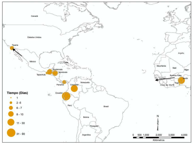Por otra parte, los datos empíricos recopilados refuerzan lo presentado en trabajos previos con relación a las rutas migratorias, con ingresos por vía aérea arribando a Brasil o Ecuador (Echeverri, 2016; Álvarez Velasco; 2020b; Miranda y Silva Hernández, 2022), y continuando después por tierra en trayectos donde la selva del Darién destaca como el sector de mayor peligro, aún para quienes disponen de algunos recursos económicos. Empero, más allá de estos datos, en la presente indagación se muestra la transformación de las estrategias migratorias familiares a partir de los procesos de reunificación en la frontera norte de México.
