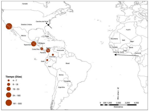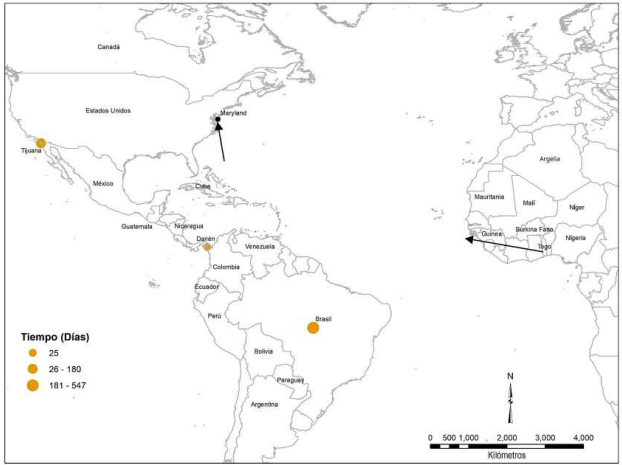 Mapa 4. Trayectoria de Addisa, de Togo a Maryland. Sitios marcados por tiempo