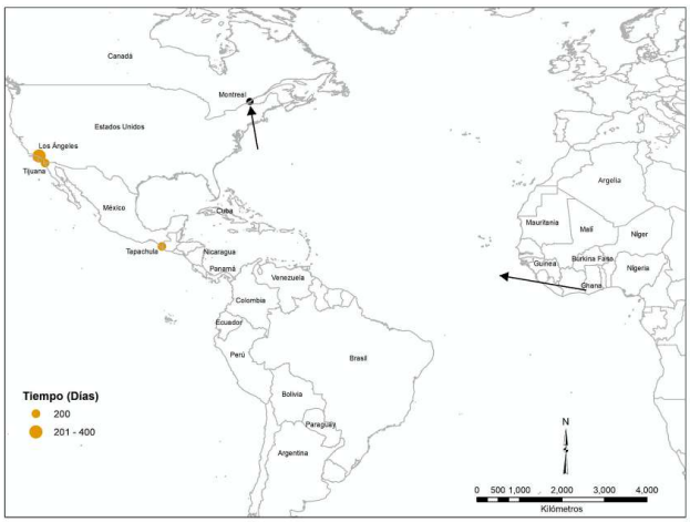 Mapa 3. Trayectoria de Issa, de Ghana a Montreal. Sitios marcados por tiempo