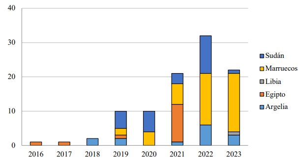 La Región Norte se integra por Argelia, Egipto, Libia, Marruecos, Sudán y Túnez. Como se observa en el cuadro 7, aunque los migrantes provenientes de esta región representan una minoría, muestran una tendencia creciente en las solicitudes de refugio, con cifras que se triplican entre 2020, cuando se registra la solicitud de 10 migrantes, y 2022, con 32, aun cuando el flujo disminuyó en 2023, llegando solo a 22. Dentro de este período, destaca en los tres últimos años la presencia de migrantes originarios de Sudán, Marruecos y Argelia, como puede verse en la gráfica 3.