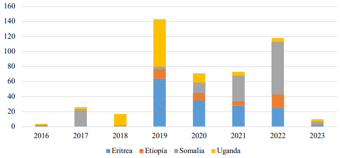 Como se detalla en el cuadro 8, la Región Este se integra por Burundi, Comores, Djibouti, Eritrea, Etiopía, Kenia, Madagascar, Malaui, Mauricio, Mozambique, Ruanda, Seychelles, Somalia, Tanzania, Uganda, Zambia y Zimbabwe, siendo Eritrea, Somalia y Uganda quienes tienen más presencia a lo largo del período analizado. En esta región, como muestra la gráfica 4, se observan cambios abruptos, con picos en los años 2019 (145 personas) y 2022 (130). Además de los efectos de la pandemia por COVID-19, se intuye que estas variaciones reflejan salidas provocadas por coyunturas específicas, sin que se establezcan redes migratorias (Gurak y Caces, 1992) que permitan la continuidad en los flujos.