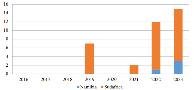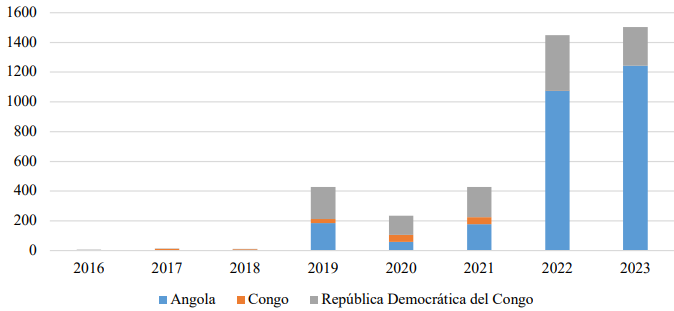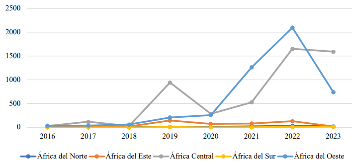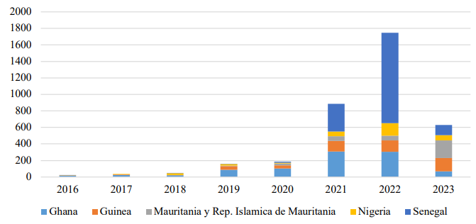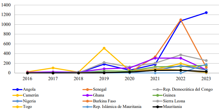 En este mismo sentido, el elevado número de casos de Mauritania en el año 2023 señala la importancia de analizar el desarrollo de este flujo en los próximos años, para determinar si se tratará de un aumento de carácter coyuntural –con un posterior declive en el año 2024–, o si por el contrario se trata del inicio de un período de crecimiento. Sólo los datos que se produzcan durante el año 2024 y los subsecuentes permitirán responder dicha pregunta. En contraste, el aumento sostenido en el flujo migratorio de personas originarias de lugares como Ghana o Angola, podría estar relacionado con la formación de redes migratorias y la estabilización de un flujo duradero.