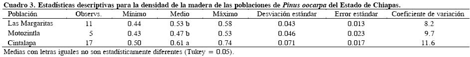 Se detectaron diferencias (P ≤ 0.05) para la densidad de la madera entre las tres poblaciones naturales de P. oocarpa (Cuadro 2). El promedio de todos los individuos de la densidad de la madera fue de 0.56 g cm3, con valores mínimo de 0.43 y máximo de 0.74 g cm3, y un coeficiente de variación (CV) de 13.9% (Cuadro 3). La respectiva desviación estándar fue de ± 0.078 g cm3 y el error estándar de 0.014 g cm3. Este promedio estimado (0.56 g cm3) permite clasificarla como una madera "pesada", de acuerdo con la clasificación de Markward y Heckt (Echenique y Díaz, 1969).