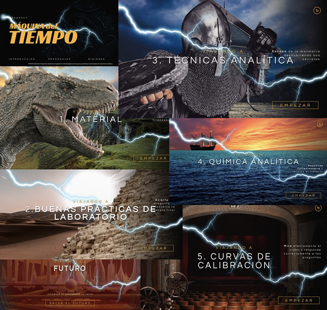 El CE La Máquina del tiempo se compone de 5 épocas del pasado, cada una con diferentes ítems sobre el tema correspondiente 1: Época I. Material, 5 ítems, temas básicos del material de laboratorio; Época II. Buenas prácticas de laboratorio, 5 ítems, como debemos trabajar experimentalmente; Época III. Técnicas analíticas, 5 ítems, para estimular la aplicación de algunas técnicas; Época IV. Química Analítica, 5 ítems, retoma algunos principios de la química analítica en disolución y estadística y Época V. Curvas de calibración, 3 ítems, con un video corto que repasa la calibración química para la técnica de UV-Vis.